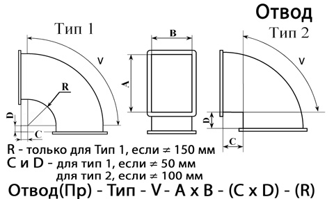 Отводы изготавливаются в трех исполнениях Тип 1, Тип 2, Тип 3. Так же отводы 90 градусов прямоугольного сечения могут быть изготовлены с дополнительными перемычками из уголка, шпильки, прутка для увеличения жесткости и с рассекателями потока воздуха проходящего через отводы.